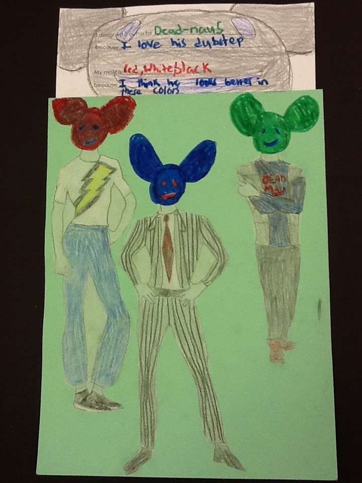 5th graders had a mission to design 3 outfits for 1 person with a common motif, or theme. They did a lot of pre-writing and designing, spent several weeks perfecting their outfits, and then reflected on their work as designers. I know I would LOVE to wear some of these outfits!